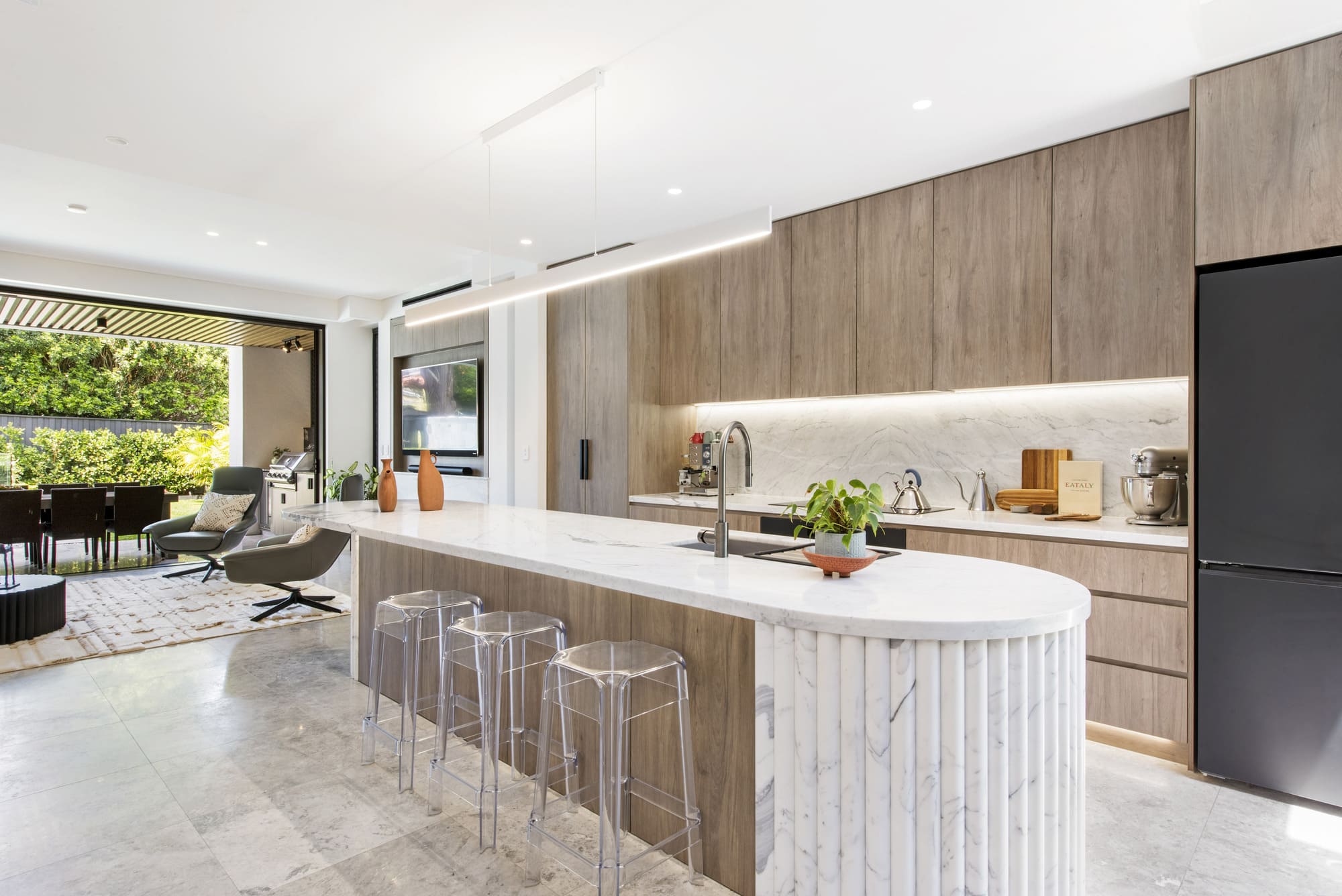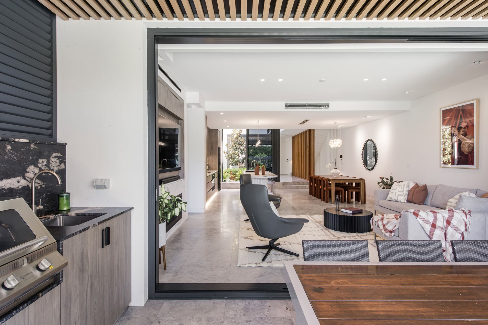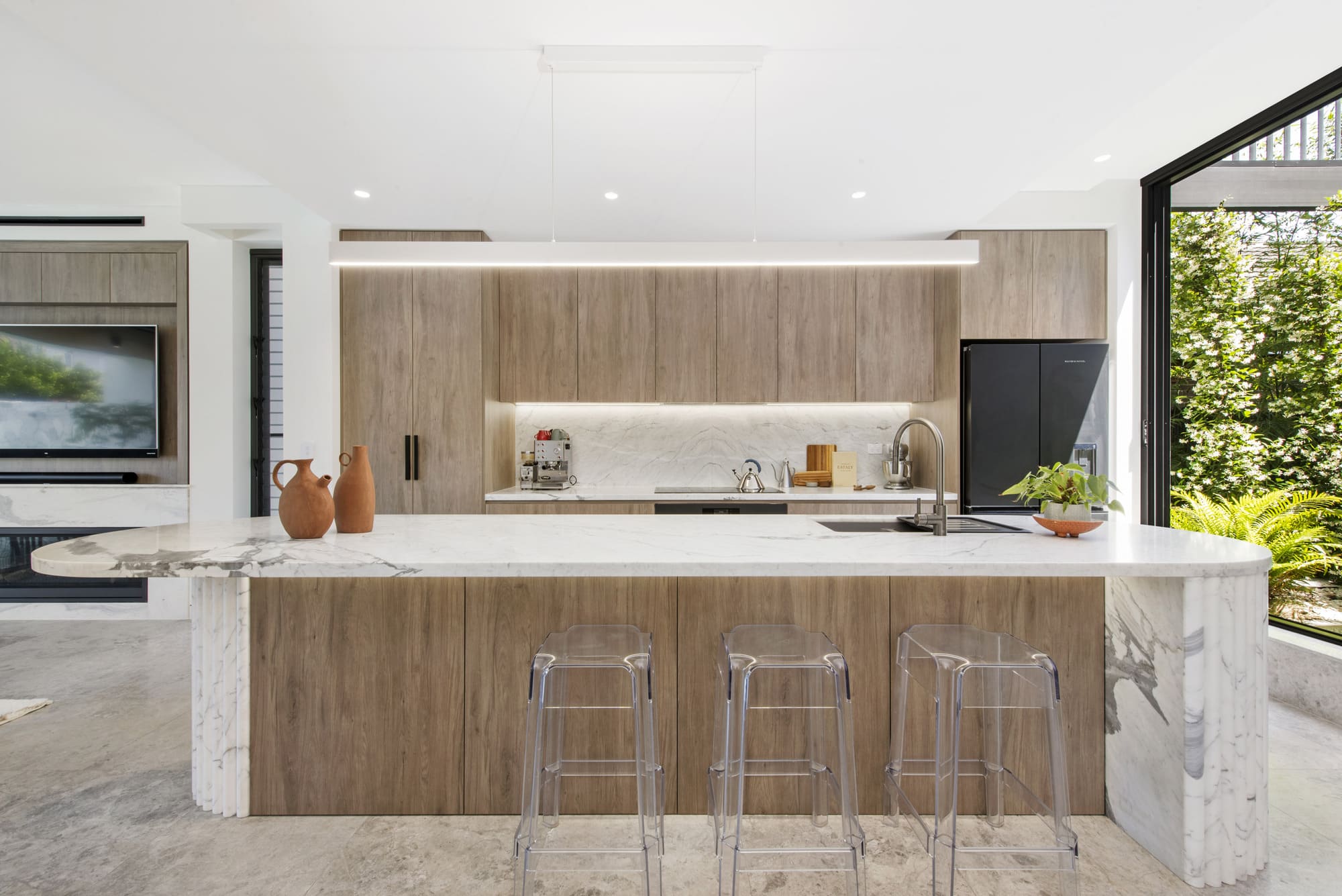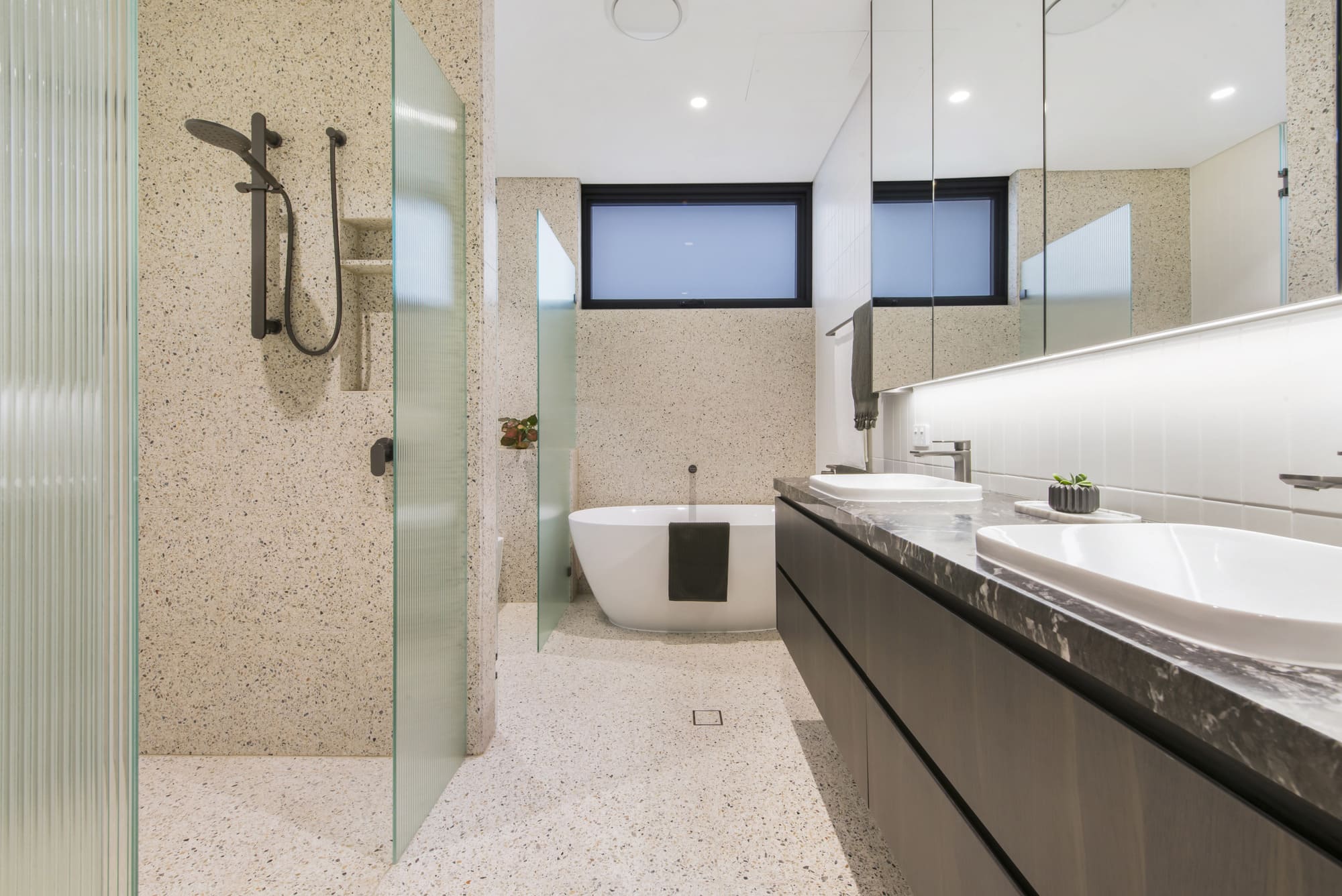 Inside the home, bespoke shower screens extend the same design intent into the bathrooms. The glass panels, paired with minimalist profiles, are composed to feel light and precise — defining the shower area without fragmenting the room. The result is an atmosphere of clarity and calm, where surfaces, reflections and natural light work together with restraint.
